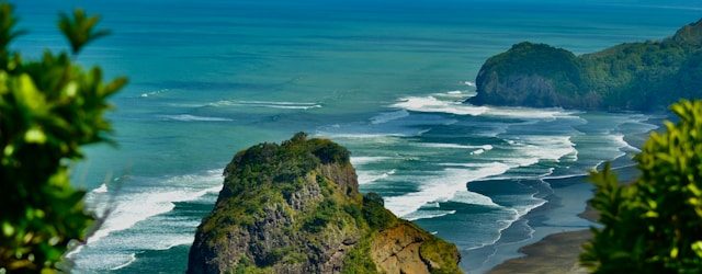 Just west of Auckland, Piha is wild, moody, and dramatic—especially beautiful in winter. Climb Lion Rock, hike to Kitekite Falls, and explore the coastal cliffs. On the way, stop at the Arataki Visitor Centre for sweeping views of the Waitākere Ranges.